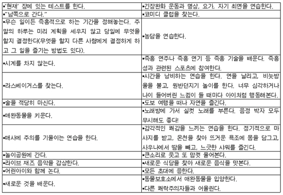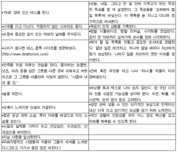 ¶ÇÇÑ ¿¬±¸ °úÁ¤¿¡¼ »ç¶÷µéÀÇ ½Ã°£¿¡ ´ëÇÑ Åµµ, Áï ½Ã°£°üÀÌ Å©°Ô ¿©¼¸ °¡Áö·Î ³ª´¶´Ù´Â»ç½Çµµ ¹ß°ßÇß´Ù. "°ú°ÅºÎÁ¤Àû ½Ã°£°ü, °ú°Å±àÁ¤Àû ½Ã°£°ü, ÇöÀç¼÷¸í·ÐÀû ½Ã°£°ü, ÇöÀçÄè¶ôÀû ½Ã°£°ü, ¹Ì·¡ÁöÇâÀû ½Ã°£°ü, ÃÊ¿ùÀûÀÎ ¹Ì·¡ÁöÇâÀû½Ã°£°ü"ÀÌ ¹Ù·Î ±×°ÍÀÌ´Ù. Çʸ³°ú Á¸Àº ½Ã°£°ü °Ë»ç¸¦ ÅëÇØ ÀÚ½ÅÀÇ ½Ã°£°üÀÌ ¾îµð¿¡ Ä¡ÁߵǾî ÀÖ´ÂÁö È®ÀÎÇϰí, ±×·± ´ÙÀ½ ½Ã°£°üÀ» È®ÀåÇÏ´Â ÈÆ·ÃÀ»ÅëÇØ ¼ÒÁßÇÑ ½Ã°£À» ÃÖ´ëÇÑ À¯ÀÍÇÏ°Ô È°¿ëÇÏ´Â ¹æ¹ýÀ» ¾Ë·ÁÁÖ°íÀÚ ÇÑ´Ù. ±×·¸°Ô µÈ´Ù¸é ´©±¸³ª ºÎÁ¤ÀûÀÎ °æÇèÀ» ±àÁ¤ÀûÀ¸·Î ÀüȯÇÏ´Â ¹ýÀ» ¹è¿ì°í,ÇöÀ糪 ¹Ì·¡ ¾î´À Çϳª¿¡ ¸Í¸ñÀûÀ¸·Î ÁýÂøÇÏÁö ¾ÊÀ¸¸é¼ °¢°¢ÀÇ ±àÁ¤ÀûÀÎ ¿ä¼ÒµéÀ» Ȱ¿ëÇÏ´Â ¹ýÀ» ¹è¿ì°Ô µÉ °ÍÀÌ´Ù. ÀÌ Ã¥À» ÅëÇØ¼ ½Ã°£¿¡ ´ëÇÑÀΰ£ÀÇ ÀνĿ¡ ´ëÇÏ¿© ±íÀÌ ÀÖ°Ô µé¿©´Ùº¸°í ½Ã°£°ú ´õ¿í µ·µ¶ÇÏ°Ô °ü°è¸¦ ¸Î´Â ¹æ¹ý°ú, ÇÊ¿äÇÏ´Ù¸é ±× °ü°è¸¦ º¯È½ÃŰ´Â ¹æ¹ý¿¡ ´ëÇØ ¹è¿ï ¼ö ÀÖÀ»°ÍÀÌ´Ù.